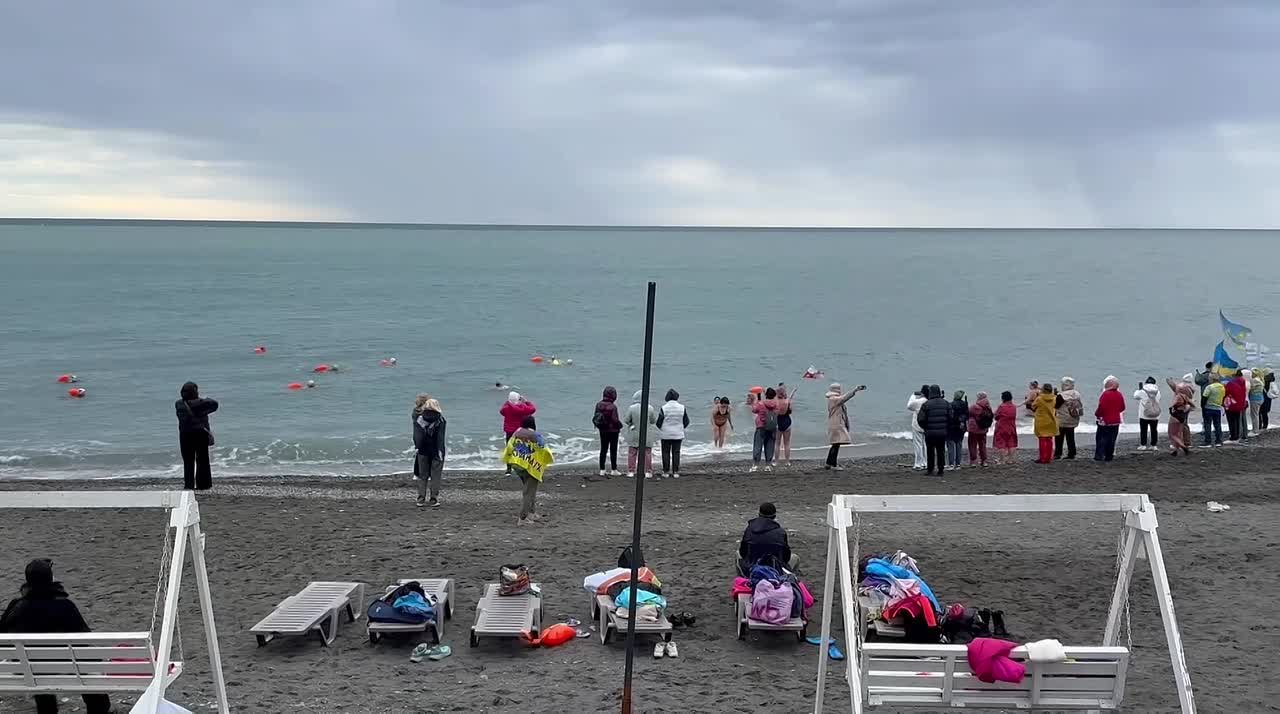 Зимний берег, прохладное море и группа людей в купальниках с флагами, спокойно плывущая в дождь берега. Без объявлений и объяснений.