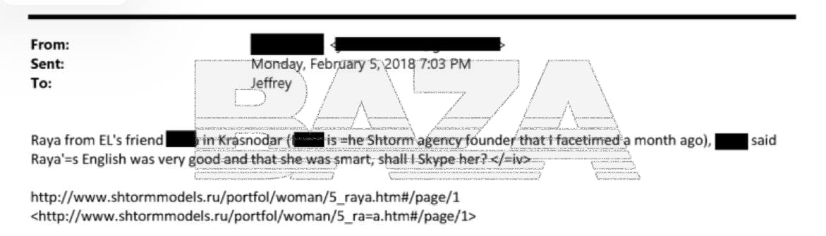 В рассекреченных документах фигурирует письмо от февраля 2018 года, в котором скандальному миллиардеру предложили пригласить на вечеринку девушку Раю из краснодарского модельного агентства «Shtorm». Агентство занимается съёмками для рекламы и журналов, участвует в показах мод, практиковало международное сотрудничество и выезды.