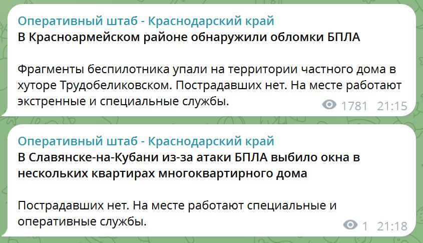 Краснодарский край. Оперштаб информирует о последствиях налёта БПЛА.