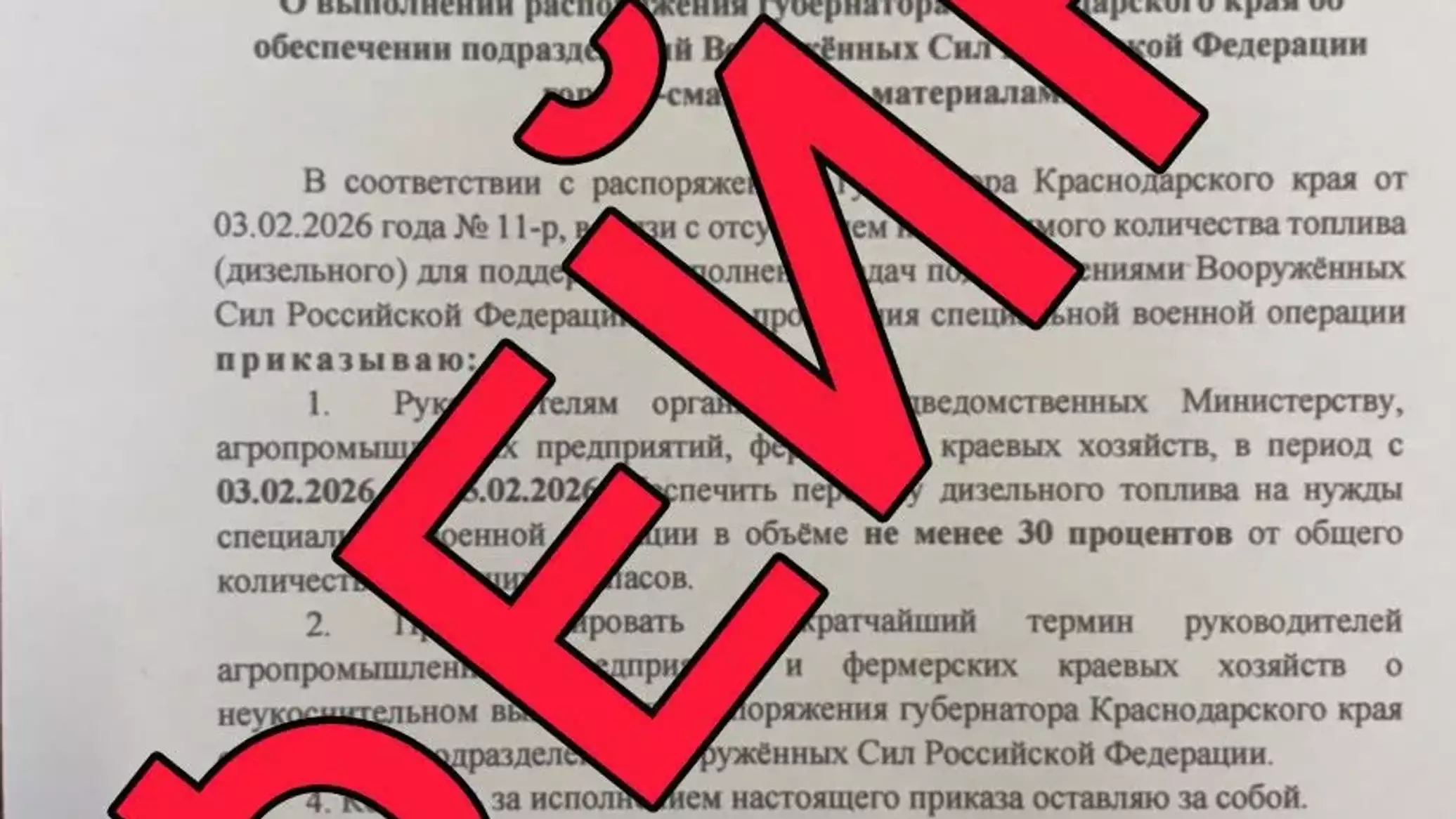 В оперативном штабе пояснили, что "распоряжение" губернатора Краснодарского края и "приказ" и.о. министра сельского хозяйства и перерабатывающей промышленности региона Федора Дереки, о том, что аграрии Кубани должны передать 30% имеющегося дизельного топлива и иных горюче-смазочных материалов на нужды Вооруженных сил Российской Федерации, распространили некоторые Telegram-каналы и ряд СМИ.