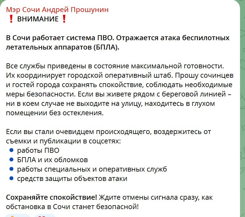 Местные жители периодически слышат громкие взрывы над городом. Мэр Андрей Прошунин попросил сочинцев соблюдать спокойствие — работает система ПВО.Телегу замедляют, подписывайся...