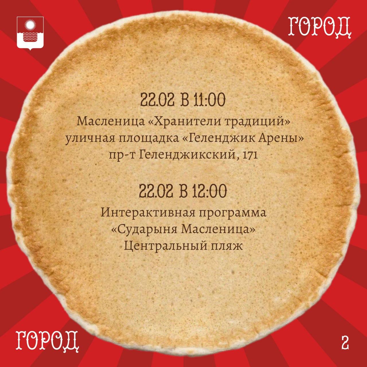 В это же время на Центральном пляже Геленджика пройдут игры, а 22 февраля, в воскресенье, в 12:00 - интерактивная программа «Сударыня Масленица» со сжиганием чучела – древним ритуалом, означающим прощание с зимними холодами и встречу весеннего тепла.Мероприятие «Спеши народ, Масленица идёт» в селе Дивноморское 21 февраля в 11:00 перенеслось с набережной на площадь у Дворца культуры села, ул. О. Кошевого, 4. Подробнее о мероприятиях - читайте в карточках.