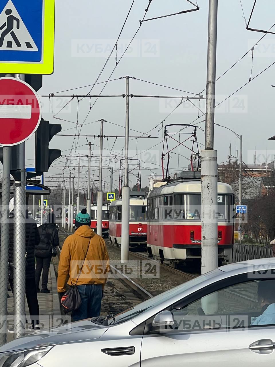 Трамваи остановились в районе пересечения улиц Калинина и Каляева в Краснодаре.