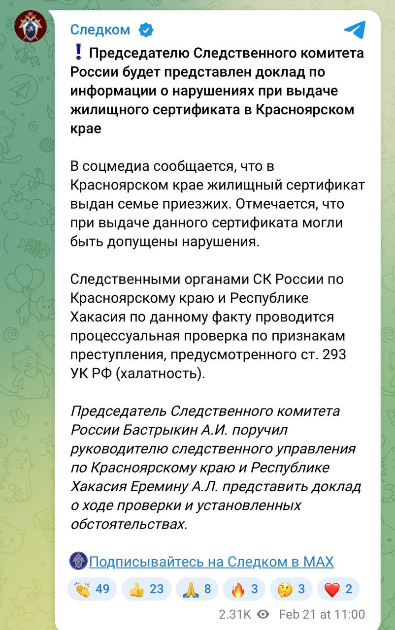 Следственный комитет Российской Федерации начал проверку по фактам выдачи жилищных сертификатов в Красноярском крае и Белореченском районе Краснодарского края. Председатель СК Александр Бастрыкин поручил представить ему доклад о ходе проверок и установленных обстоятельствах. Поводом стали публикации о распределении бюджетных средств по программам обеспечения жильём.
