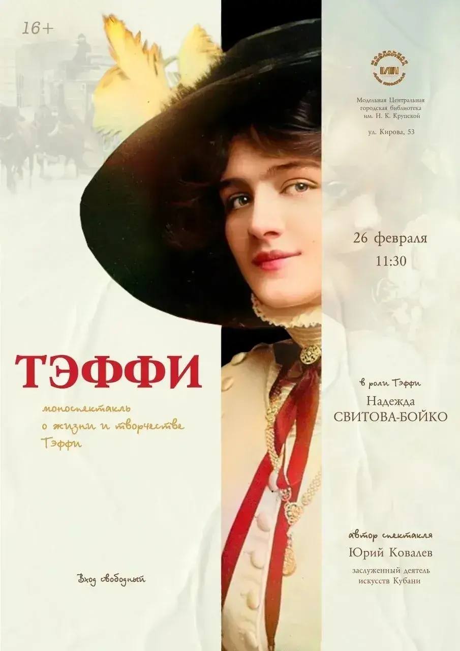 Модельная Центральная городская библиотека имени Н. К. Крупской приглашает жителей и гостей Армавира на моноспектакль «Тэффи», посвященный жизни и творчеству выдающейся писательницы Серебряного века Надежды Тэффи.