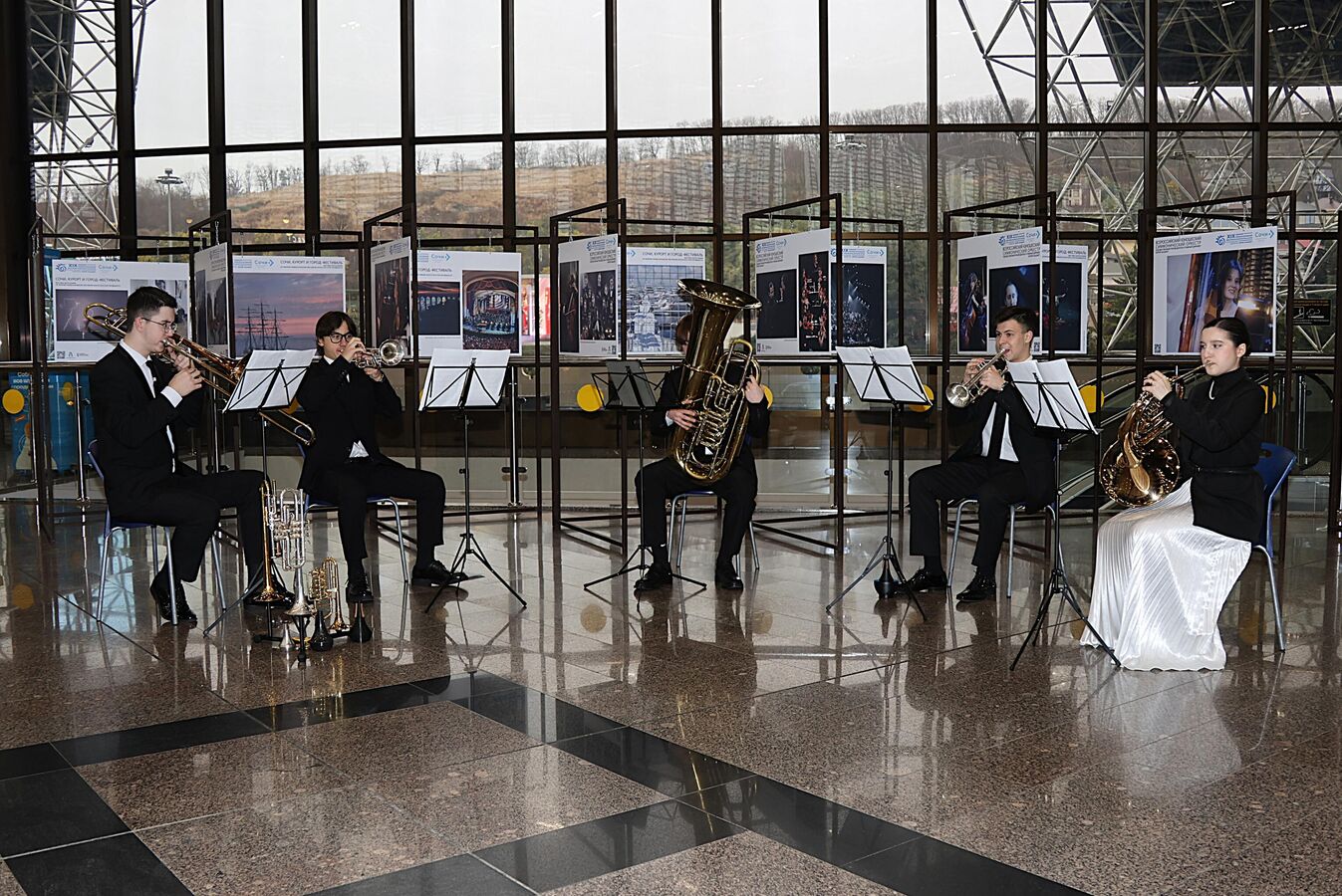Пассажиры собрались у импровизационной сцены в зале ожидания, где артисты исполнили фрагменты из классических и современных произведений, таких как "Квинтет №1 (l часть) Виктора Эвальда, "Падишах" Облова, "Escape" Kevin McKe, "Полька Джурри" Георгия Страутмана, "Ромео и Джульетта" Сергея Прокофьева.