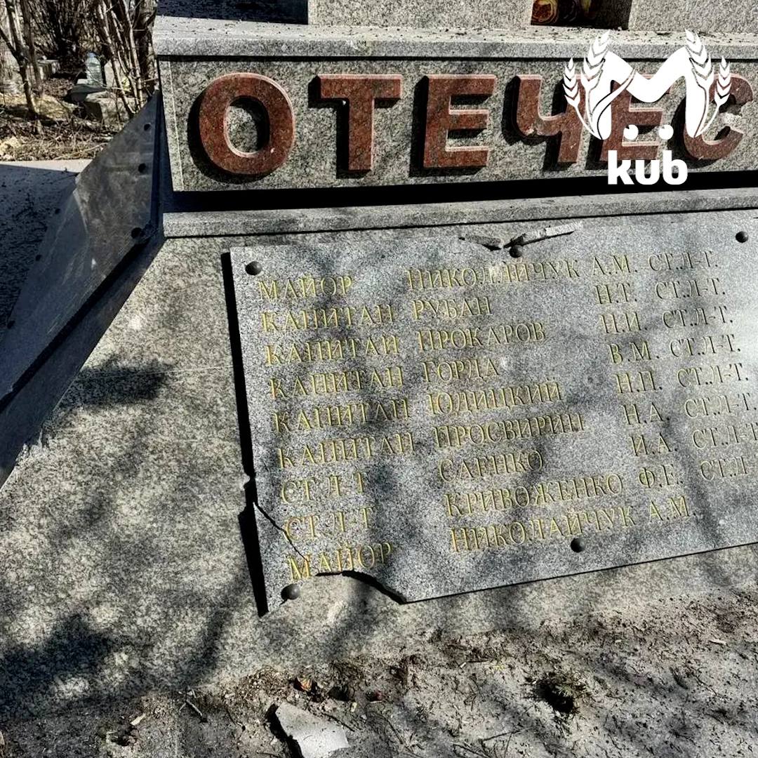 Памятник посечён осколками, табличка с именами павших солдат раскололась. Взрывной волной снесло несколько надгробий на могила местных жителей. Когда спецслужбы осмотрят место, близких пустят навести порядок.