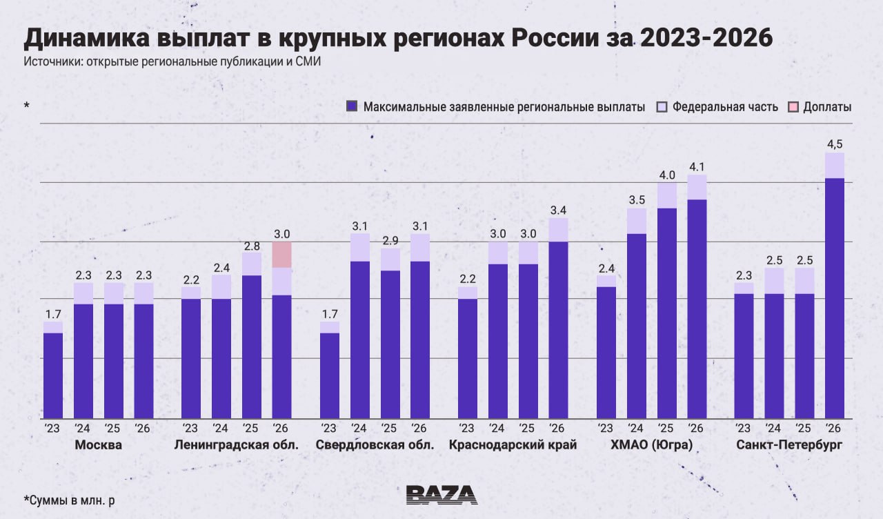 «База» обратила внимание, что размер единовременных выплат за заключение контракта на СВО значительно увеличился с 2023 по 2026 год. Федеральная выплата со 195 тыс. руб. в 2023-м выросла до 400 тысяч в 2024-м и сохраняется по сей день. Региональные доплаты в некоторых регионах выросли больше чем в два раза и сейчас достигают 3–4 млн рублей.