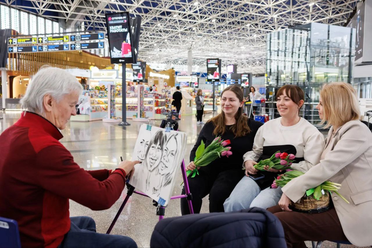 Для тех, кто хотел сохранить воспоминания об этом дне, работала фотозона, а также уникальная арт-точка: художник Василий Федоров рисовал шаржи всем женщинам, прилетающим и вылетающим из Сочи.