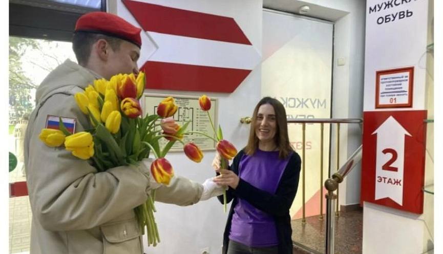 Юнармейцы отправились дарить первые тюльпаны, а вместе с ними весеннее настроение, праздничные эмоции и улыбки женщинам на главной улице любимого города.