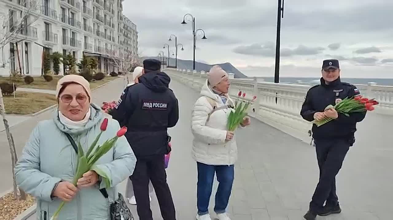Накануне праздника правоохранители отправились по городу, чтобы лично поздравить анапчанок и вручить им весенние цветы