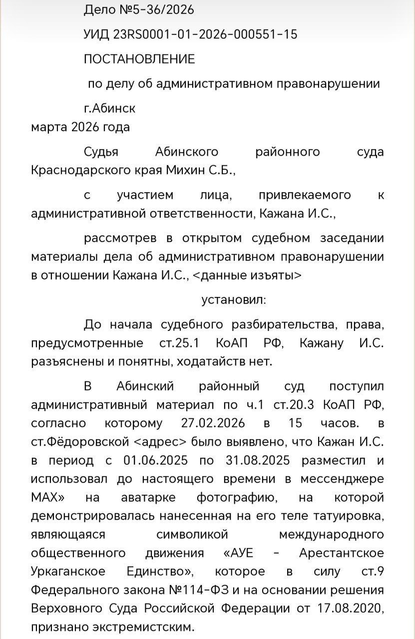 "Россиянин поставил на аватарку своё фото, на котором у него татуировка с восьмиконечной звездой — символом запрещённого в России движения "АУЕ". Мужчину оштрафовали на 1000 рублей. "