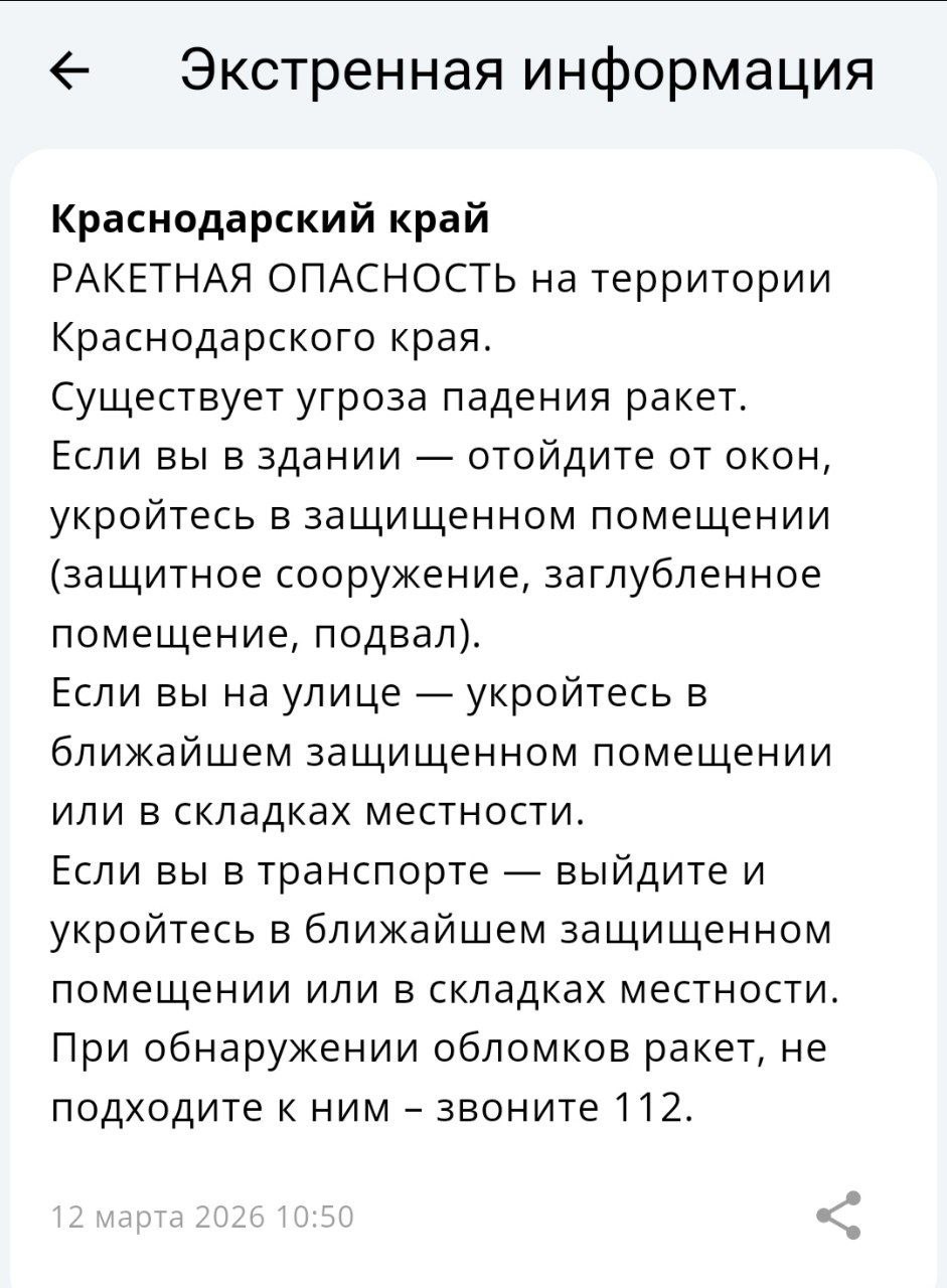На территории Краснодарского края объявлен режим ракетной опасности, сообшает МЧС России.«Ракетная опасность на территории Краснодарского края. Существует угроза падения ракет», — говорится в сообщении.12 марта в Анапе из-за угрозы атаки БПЛА отменили...