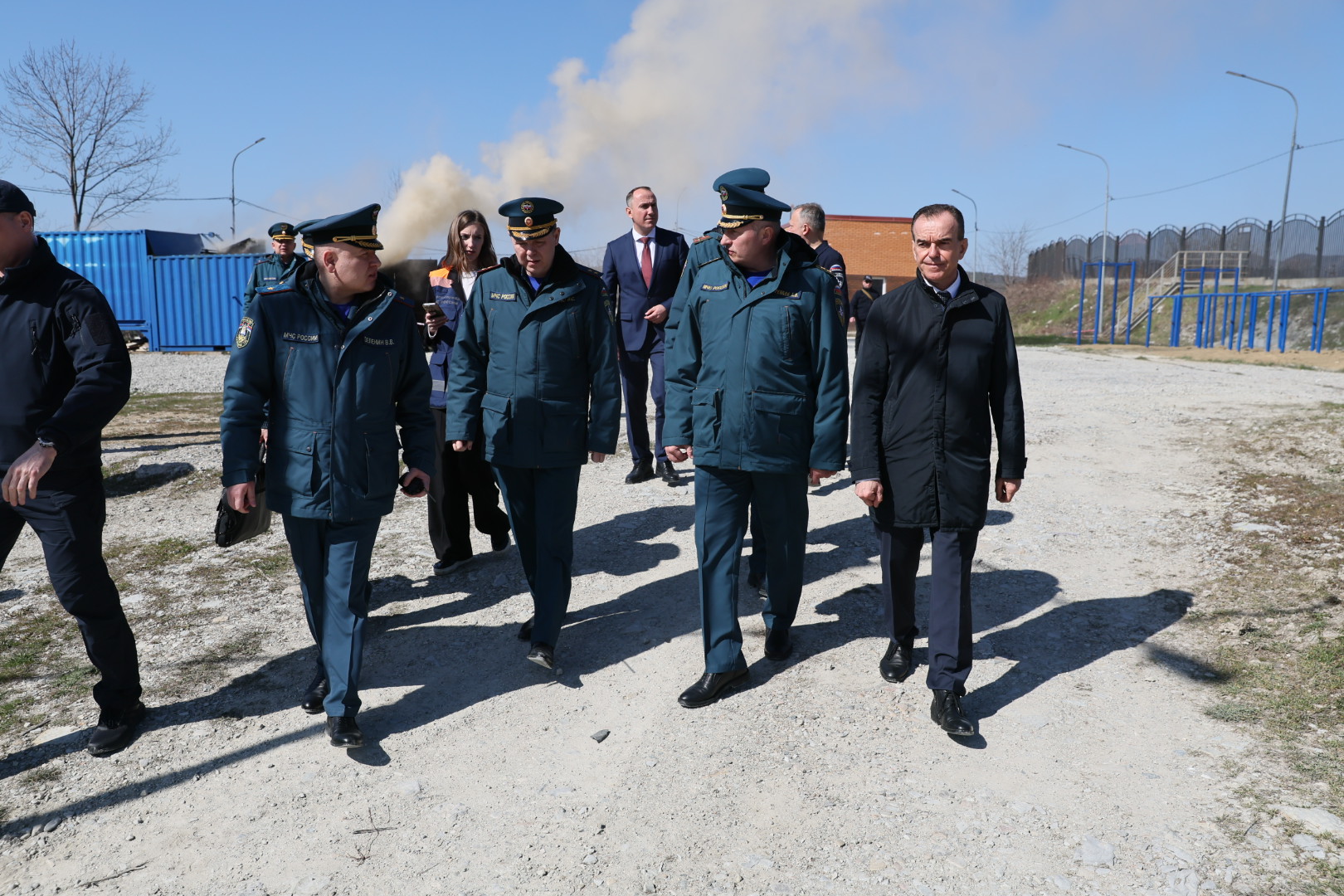 Глава МЧС России и губернатор Кубани осмотрели тренировочные площадки, специализированные классы, помещения для проживания и дежурства, а также парк пожарной и спасательной техники, используемой в образовательном процессе.