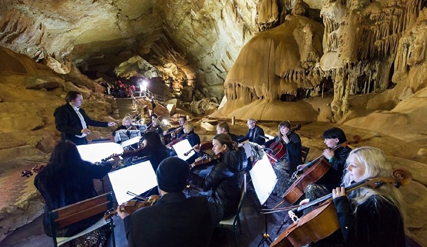 «Звуковой сплав» в пещере на горе Чатыр-Даг давно стал популярным крымским событием. Программу, которая постоянно обновляется, играют в древнем подземелье с 2017-го. Под сводами звучат великие сочинения классиков, легендарные рок- и поп-хиты. В этом году здесь представят шестую программу концерта. Перед гостями, как и прежде, выступит камерный оркестр «Новая гармония», которым руководит заслуженный деятель искусств Крыма, лауреат Государственной премии РК Денис Карлов.