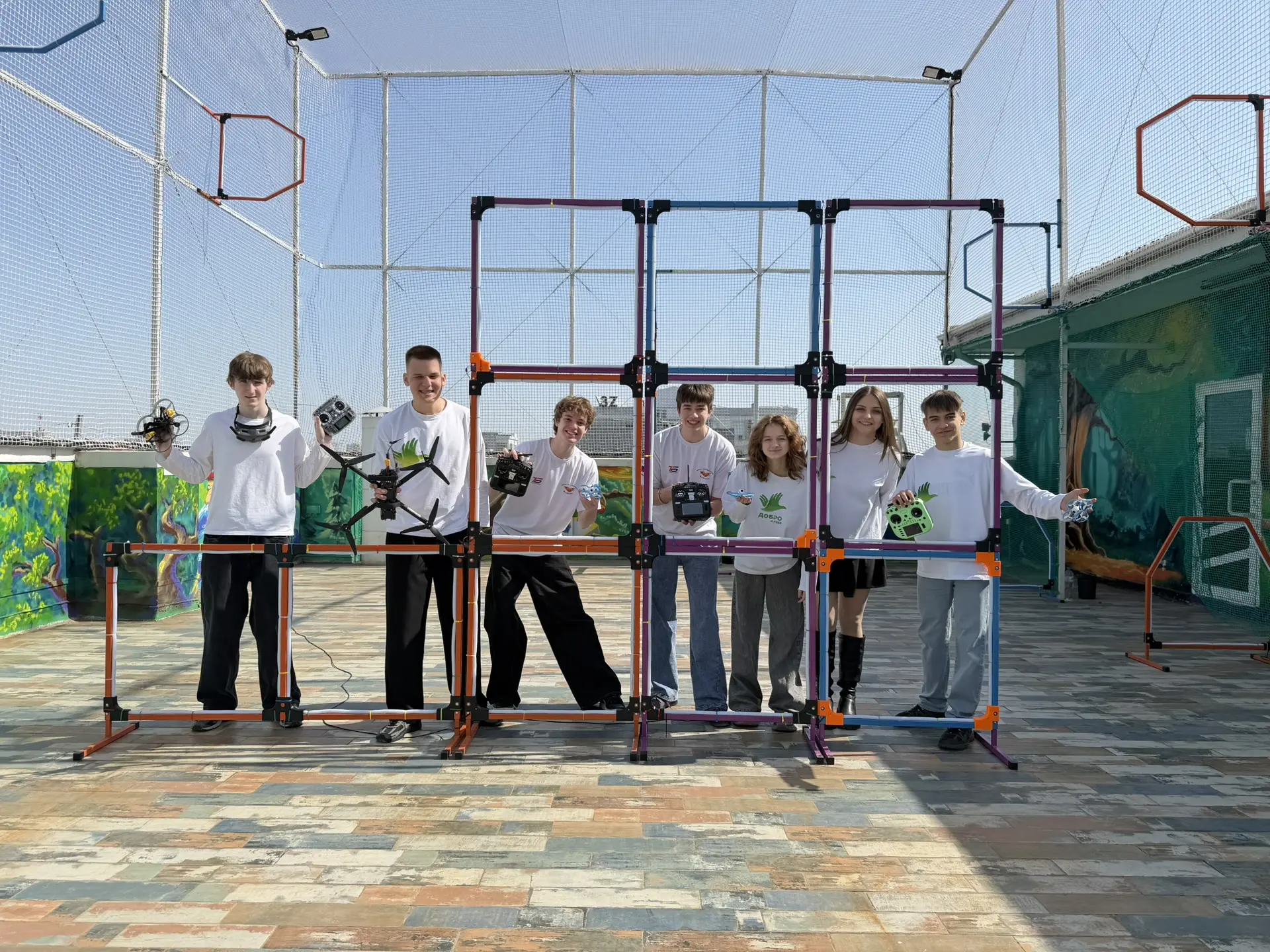 Новая площадка на базе Школы БПЛА «Добро и Небо» оснащена современной многоуровневой трассой, которая позволяет пилотам отрабатывать навыки управления дронами на новом уровне. Ее высота составляет около 9 метров, а площадь превышает 350 квадратных метров.