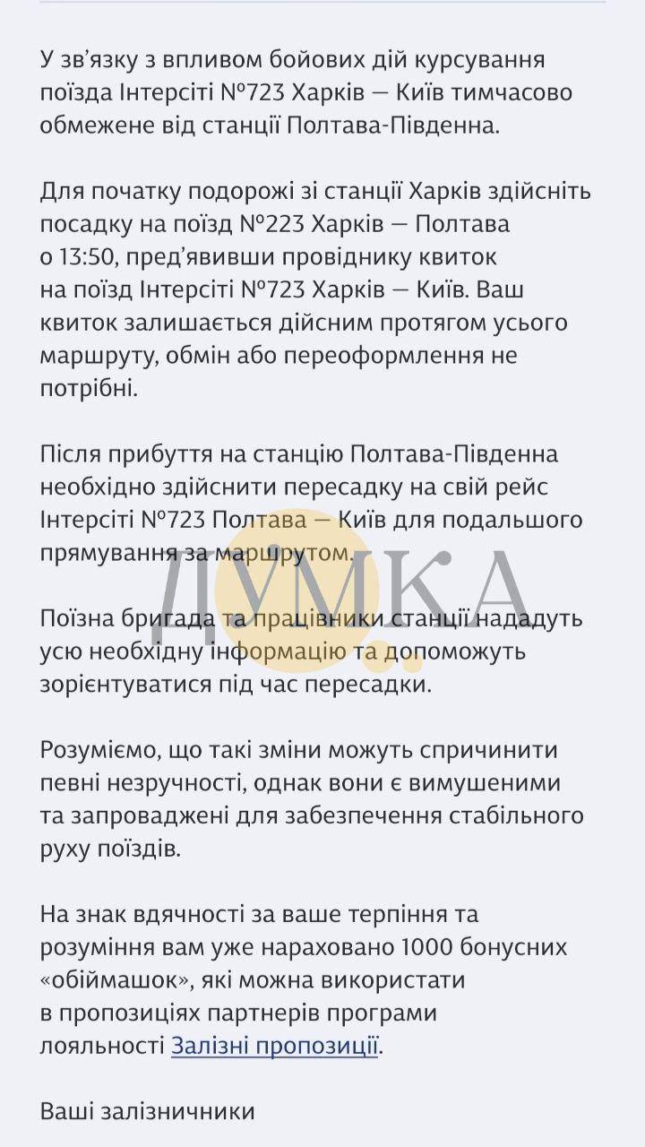 Вчера вечером пассажиры, купившие билеты, начали получать сообщения от «Укрзализныци» об отмене прямого рейса «в связи с боевыми действиями» и необходимости пересадки в Полтаве.