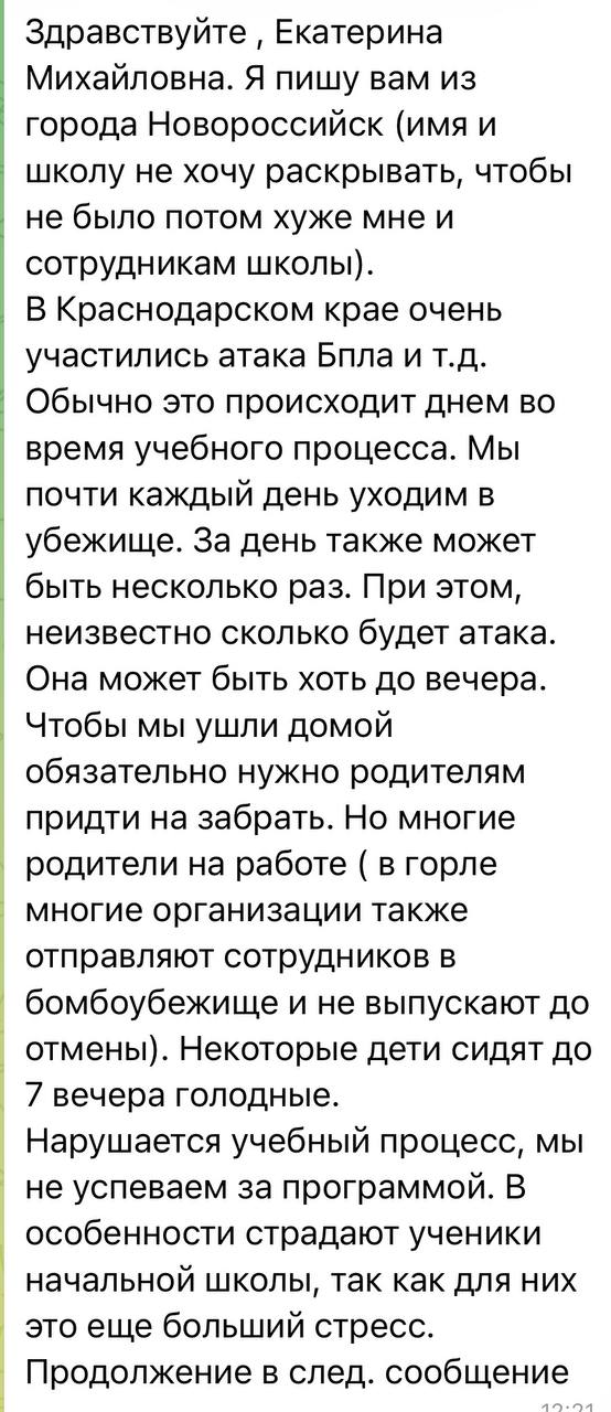 В последнее время очень много писем из Краснодарского края. Беспилотная опасность практически постоянно. Ребятам страшно, многие из них часами сидят в коридорах и подвалах вместо уроков. А родители не знают, как им вообще быть и стоит ли отправлять вообще детей в школы. В некоторых школах детей не отпускают одних домой без родителей. В итоге они сидят и ждут до вечера вместе с учителями