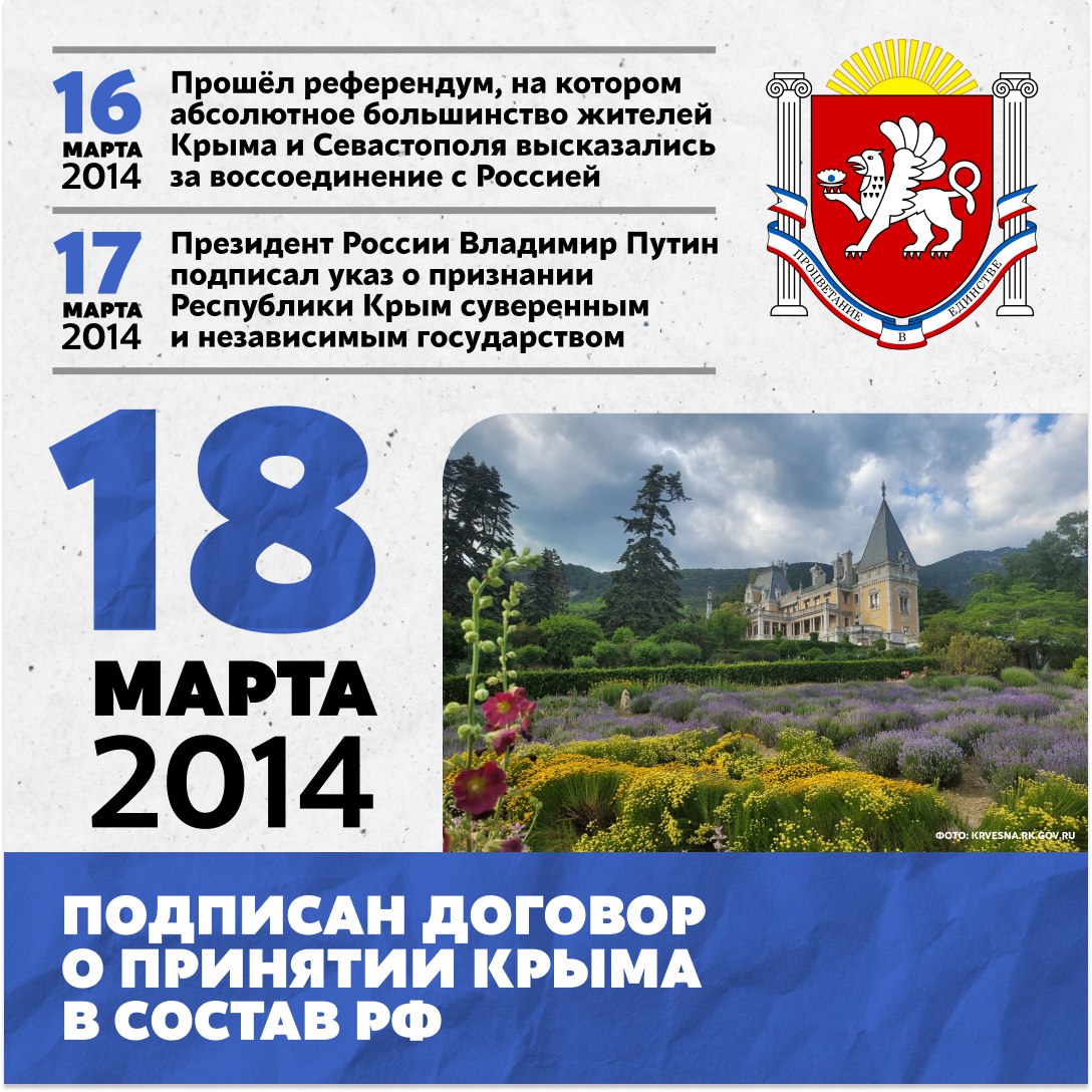 День воссоединения Крыма с Россией — важная историческая дата, которая отмечается ежегодно 18 марта начиная с 2014 года, когда Республика Крым и город-герой Севастополь официально вошли в состав Российской Федерации
