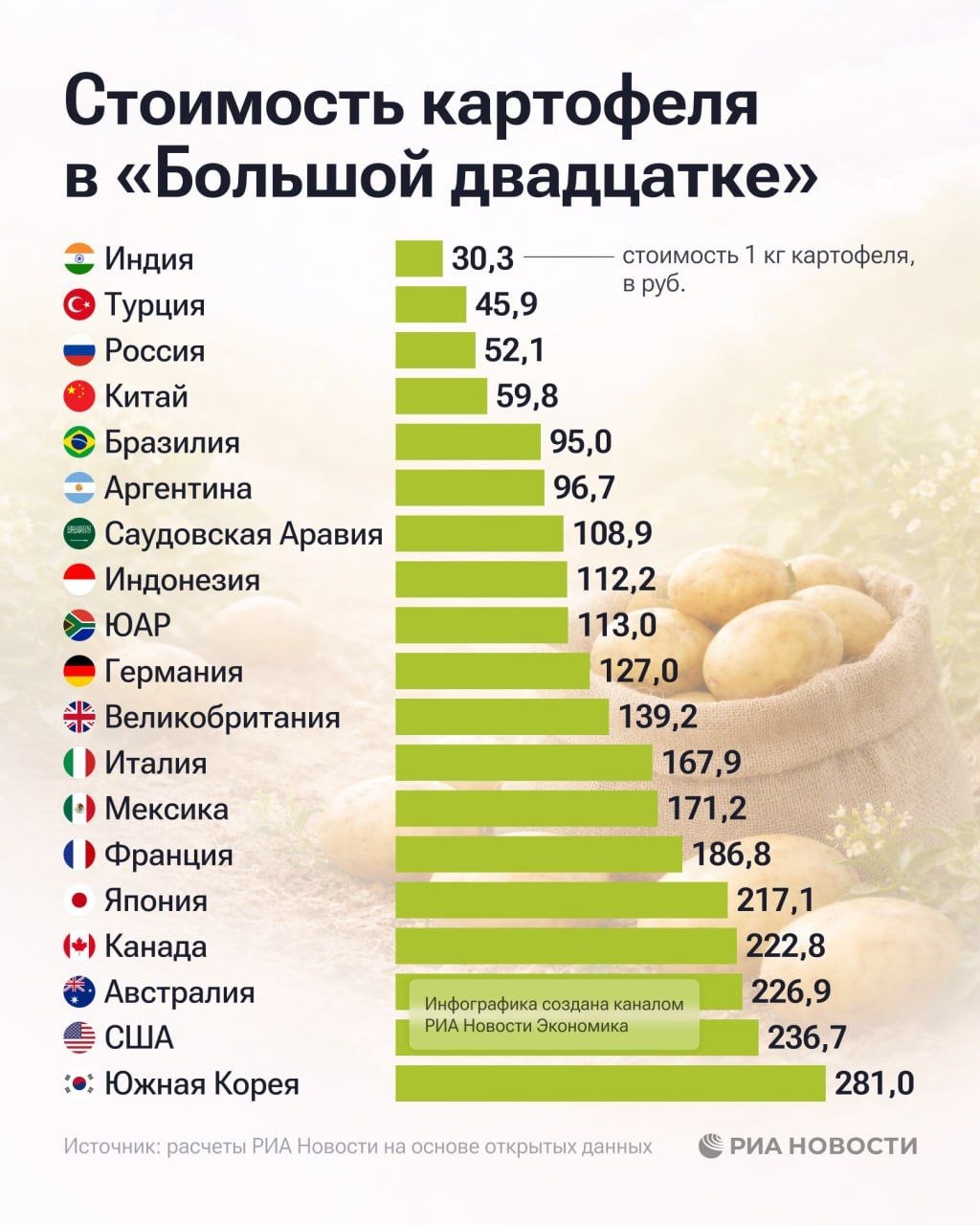 Самый дешёвый картофель среди стран G-20 (Большой двадцатки) — в Индии, Турции и России