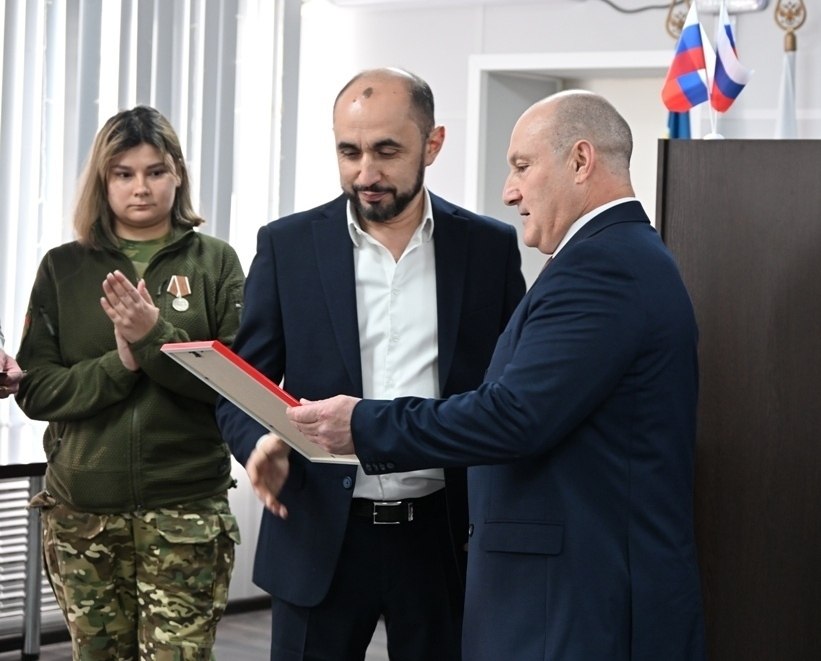 Сегодня заместитель главы Ейского района Сергей Загребельный наградил медалью "За содействие в СВО" главного врача Ейской центральной районной больницы Миграна Григоряна.