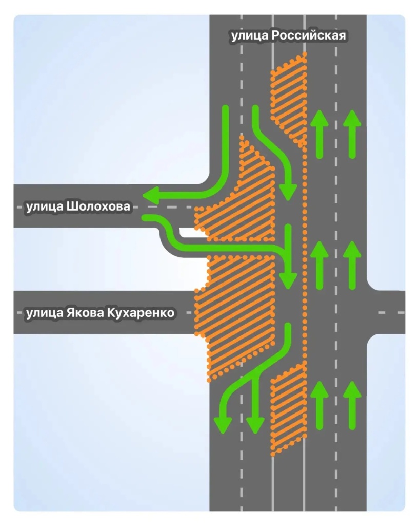 Проезд транспорта ограничен с 21 февраля на участке ул. Российской от дома № 129/1 до дома № 131/7. Выезд автомобилей с ул. им. Кухаренко на ул. Российскую недоступен. Выехать на ул. Российскую с ул. им. Кухаренко возможно по ул. Аксайской через ул. им. Шолохова и ул. Солнечную.