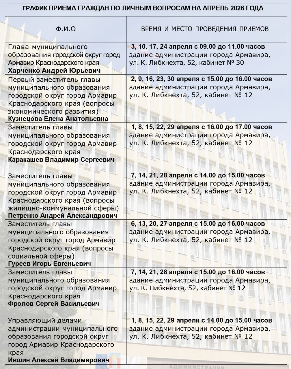 ГРАФИК ПРИЕМА ГРАЖДАН ПО ЛИЧНЫМ ВОПРОСАМ ГЛАВОЙ МУНИЦИПАЛЬНОГО ОБРАЗОВАНИЯ ГОРОДСКОЙ ОКРУГ ГОРОД АРМАВИР КРАСНОДАРСКОГО КРАЯ И ЕГО ЗАМЕСТИТЕЛЯМИ НА АПРЕЛЬ 2026 ГОДА