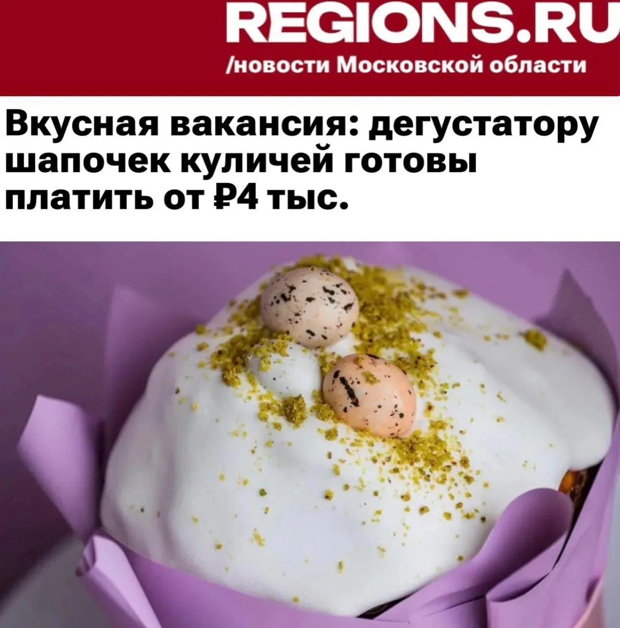 «В преддверии Пасхи в столице появилась необычная вакансия. Одно из московских кафе приглашает на работу дегустатора шапочек куличей.