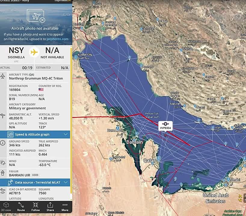Крайне занятная аномалия. Американские высотные беспилотники Northrop Grumman MQ-4C Triton (которые, к слову, уже очень давно не появляются у берегов Крыма и Черноморского побережья Краснодарского края) сократили время боевого патрулирования у берегов Ирана. Раньше машины висели над Ормузом почти сутками, теперь — короткий разведывательный полёт и сразу домой. Интересно также, что аэродром базирования этих дронов на данный момент — Эль-Ваджх на западе Саудовской Аравии, а не базы вроде Аль-Удейд в Катаре или а/б Принц Султан в Саудовской Аравии. С чем связана такая осторожность сказать сложно. Возможно, беспилотники этого типа просто берегут и стараются не допускать, чтобы КСИР их сбивали.