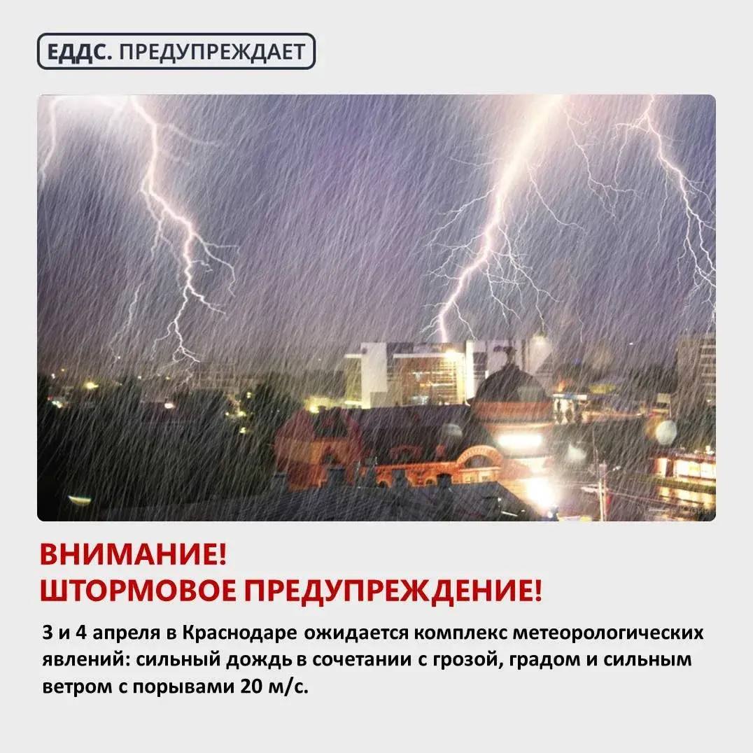 3 и 4 апреля в Краснодаре ожидается комплекс метеорологических явлений: сильный дождь в сочетании с грозой, градом и сильным ветром с порывами 20 м/с.
