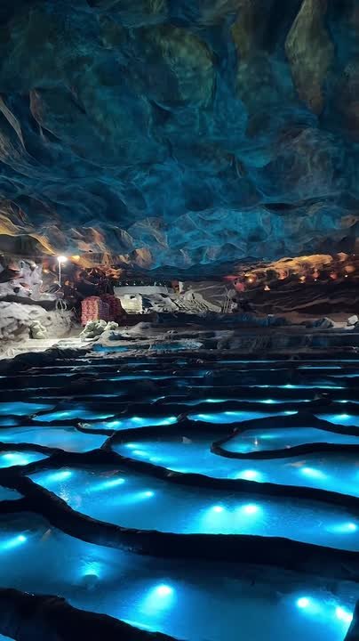 Рабочие возвели огромный искусственный грот — стены украшены подсветкой, а в центре пещеры находится сцена.