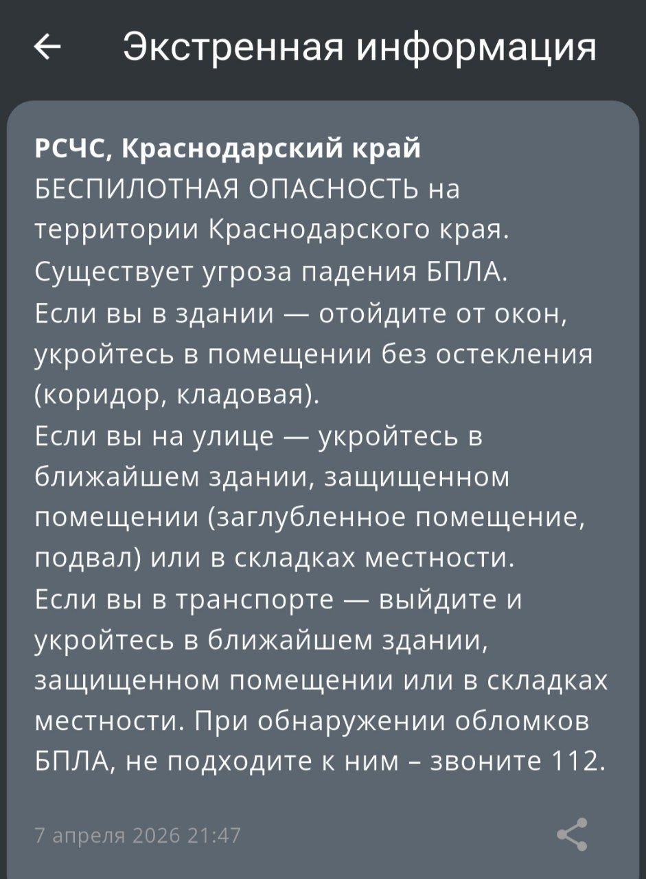 Беспилотная опасность объявлена в Краснодарском крае, сообщает РСЧС