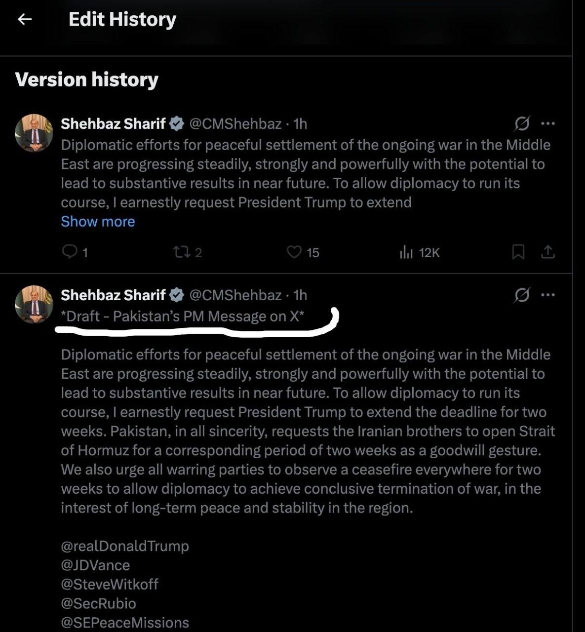 «Черновик сообщения премьер-министра Пакистана», — судя по скриншоту истории правок, премьер-министр Пакистана Шехбаз Шариф опубликовал текст с предложением о перемирии между Ираном и США вместе с технической пометкой.