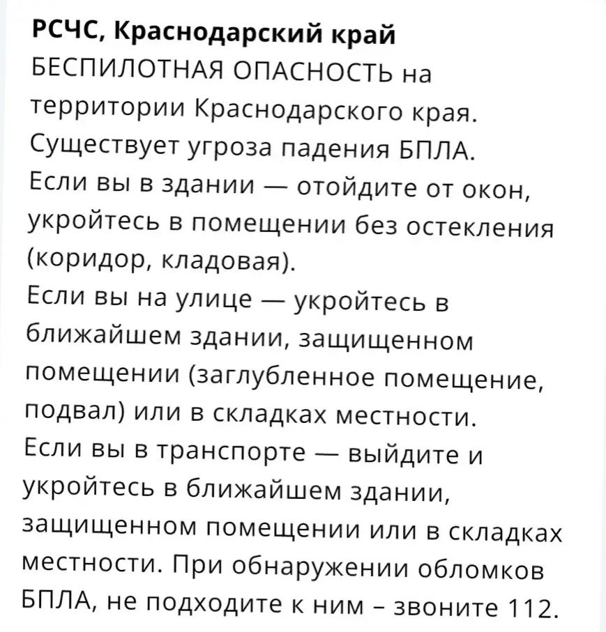 В Краснодарском крае действует сразу два предупреждения: о беспилотной угрозе и ракетной опасности.Следует позаботиться о безопасности и не подходить к окнам!Кубань...