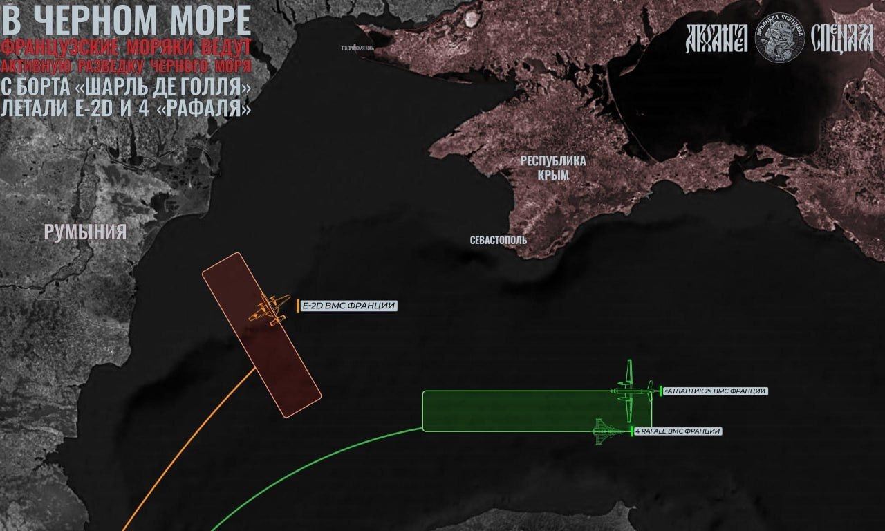 Недавно самолёт AWACS E-2D и четыре истребителя Rafale M с "Шарля де Голля" провели масштабную разведывательную операцию в направлении Крыма. E-2 действовал в юго-западной части Севастополя.