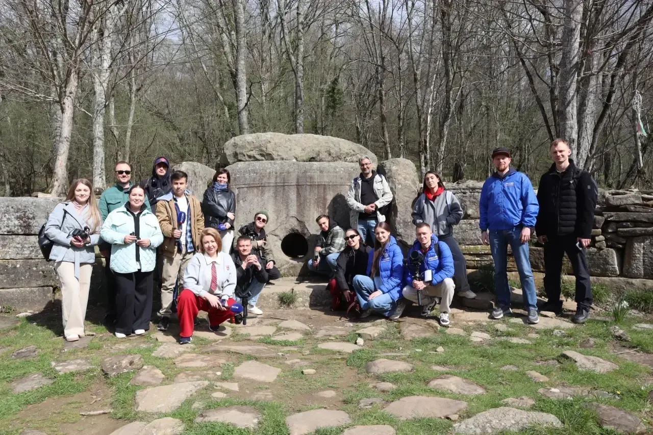 Утро началось с выезда в Дивноморский округ. Первая точка - водопады и дольмены на реке Жане. Опытный экскурсовод рассказала журналистам о тысячелетней истории этих древних сооружений. Дольмены на реке Жане уникальны: их круглые камеры сложены из прямоугольных блоков, а крыша укреплена концентрическим пазом. Нас разделяют пять тысяч лет. По мнению учёных, строителями этих сооружений были предки современных абхазов, адыгейцев и кабардинцев - народов, чья история неотделима от этой земли.