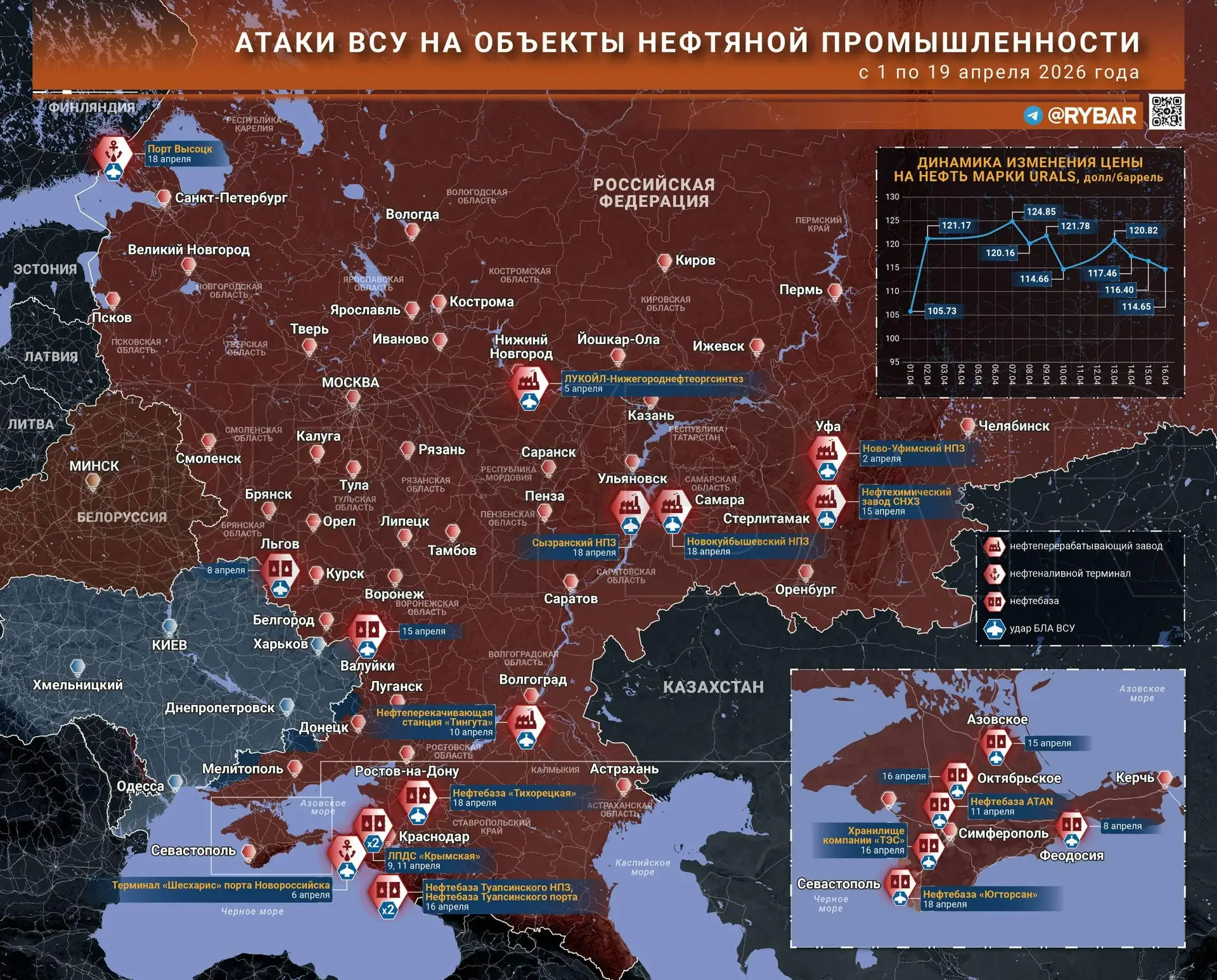 Наибольшее число налетов с начала апреля пришлось на объекты в южных регионах России. В Краснодарском крае противник осуществил несколько атак на порт Туапсе, целью которых был расположенный на его территории нефтеналивной терминал. В городе Крымск прилеты пришлись по территории одноименной перекачивающей станции, которая обеспечивает транспортировку нефтепродуктов в Черноморские гавани.