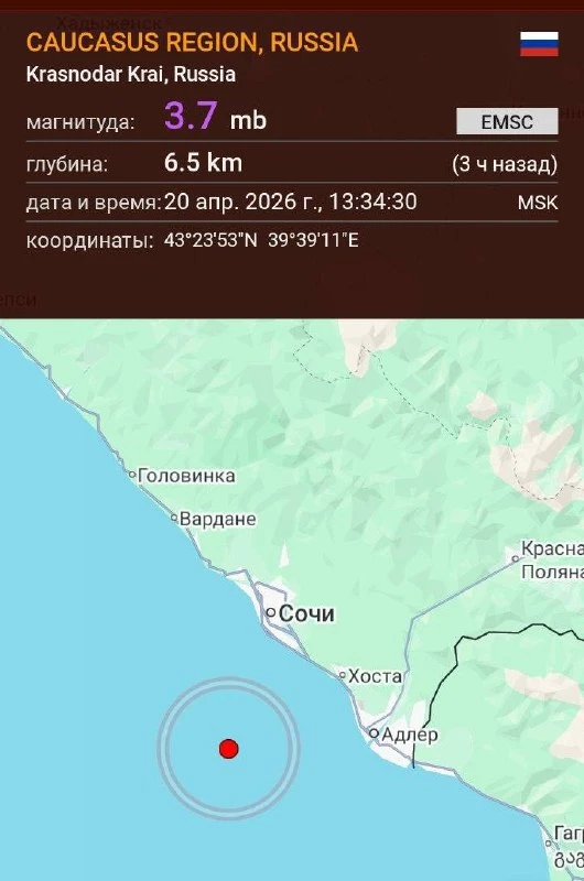 В акватории Чёрного моря недалеко от побережья Сочи 20 апреля в 13:34 зафиксировано землетрясение магнитудой 3,7