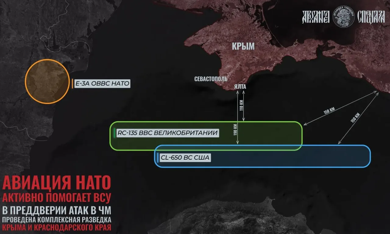 "В контексте ударов ВСУ по Черноморской зоне, где в последние несколько дней были атакованы нефтерезервуары в Севастополе и Туапсе, до начала атак была повышенная активность разведывательной авиации НАТО, которая несколько дней к ряду проводила разведку вдоль Крымского полуострова и Краснодарского края.