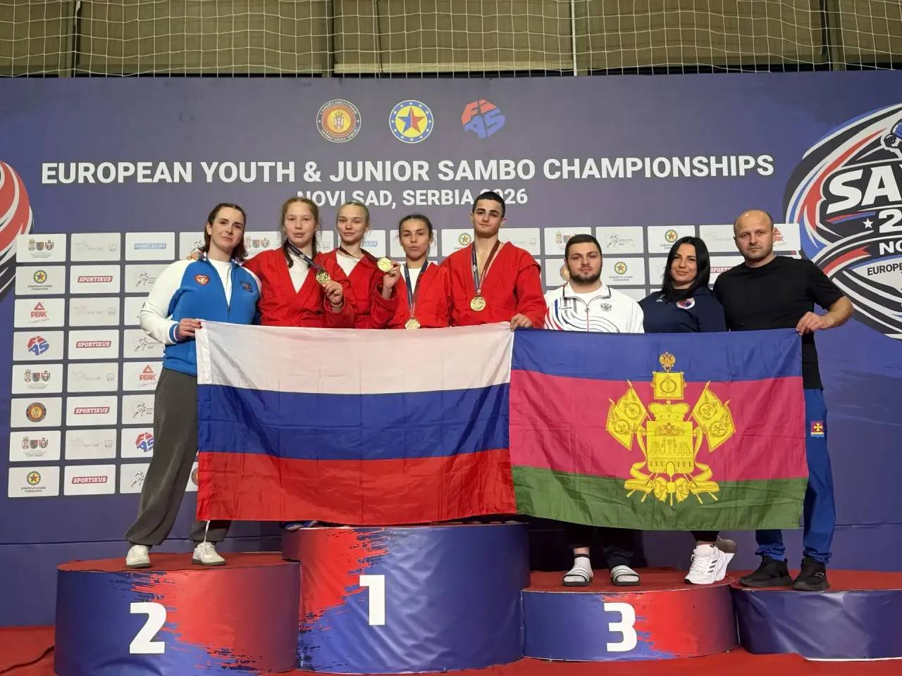 Наши кубанские самбисты – Екатерина Жданова, Валерия Козлова, Екатерина Устюжанинова и Артур Григорян – взяли золото на Первенстве Европы в Сербии!