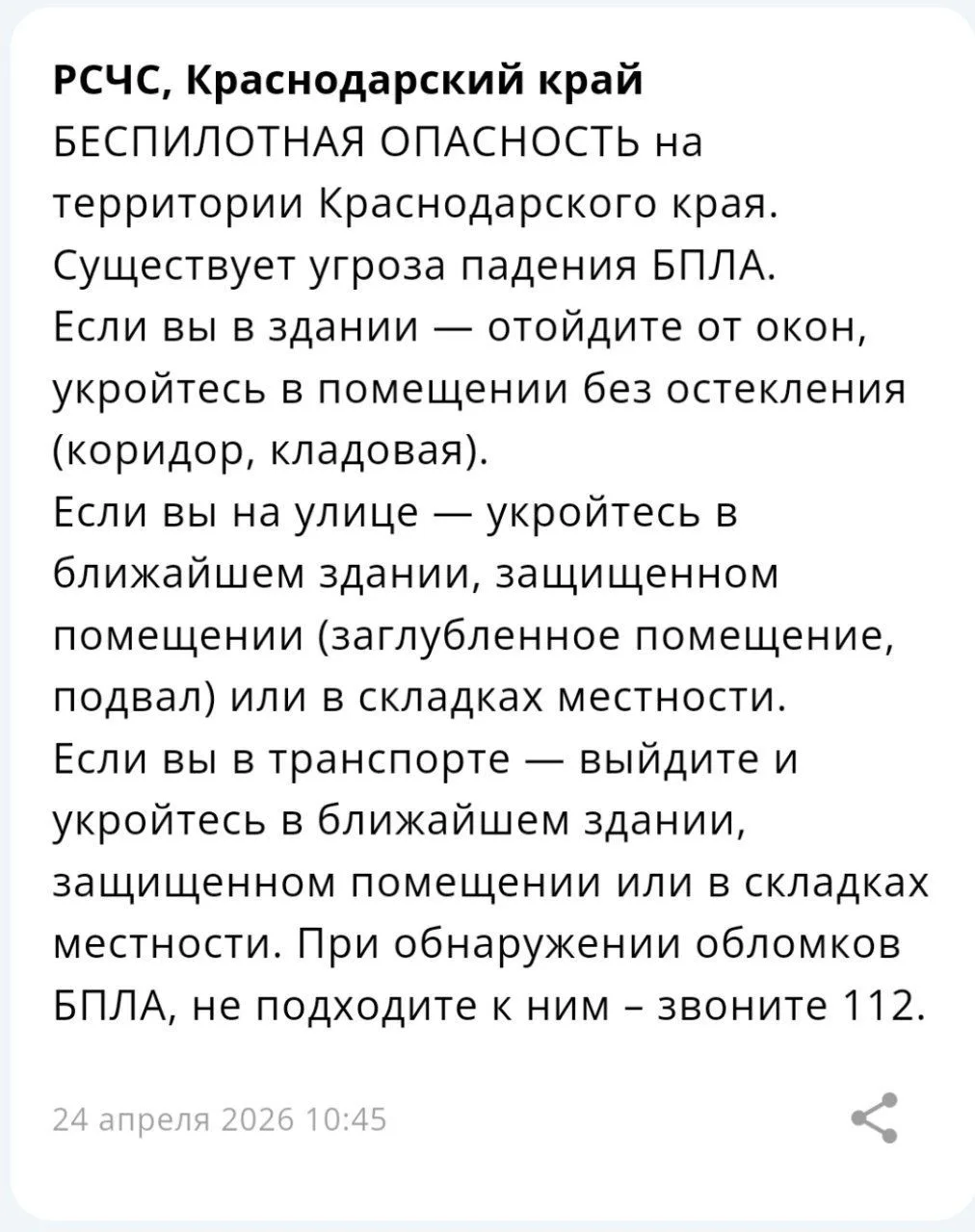 «Беспилотную опасность» объявили на территории Краснодарского края