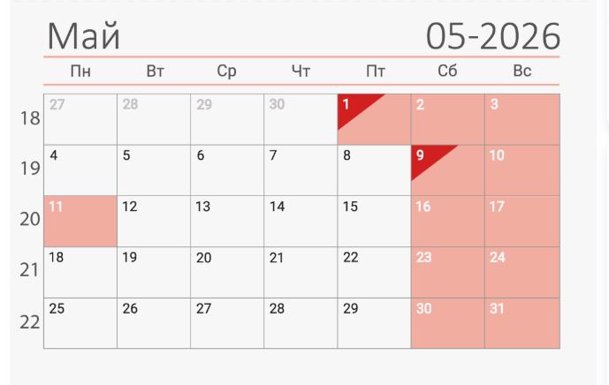 После этого будут три выходных — с 1 по 3 мая. Следующие длинные выходные ждут нас с 9 по 11 мая.