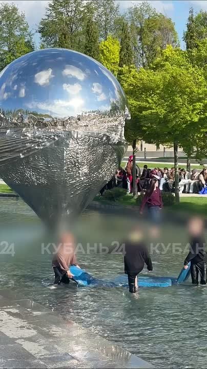 Троих "первооткрывателей" заметили в парке «Краснодар». Мальчики вытягивали из воды матрасы, которые используют посетители парка, чтобы посидеть у воды. Взрослые тоже не боятся холодной воды — девушка на фоне устроила фотосессию.