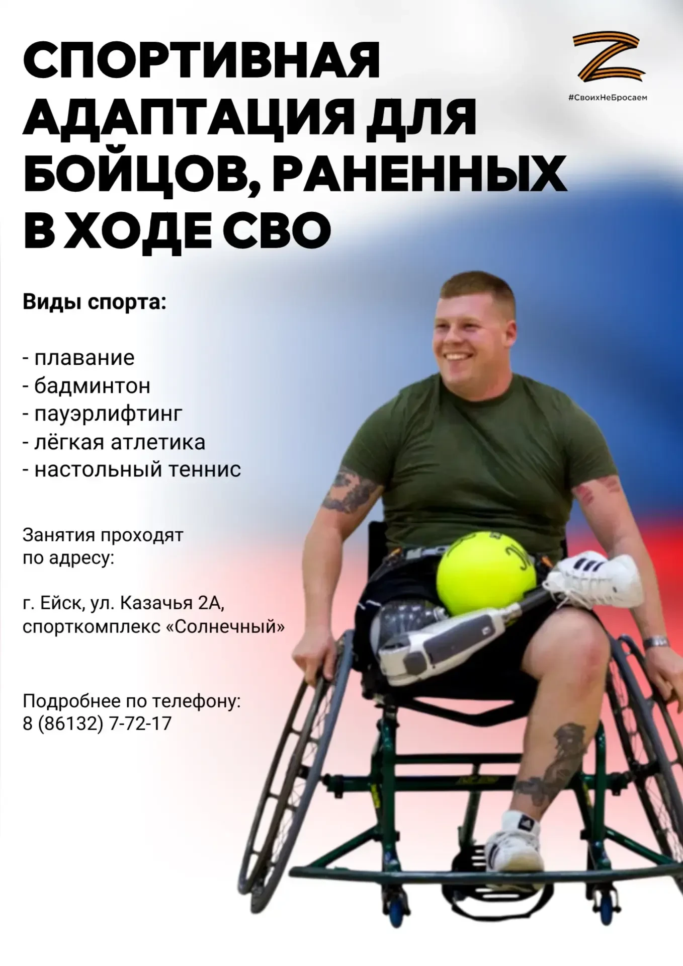 В рамках реализации мер поддержки ветеранов СВО приглашаем участников-ветеранов специальной военной операции на бесплатные занятия адаптивной физической культурой и спортом в спортивную школу «Виктория».