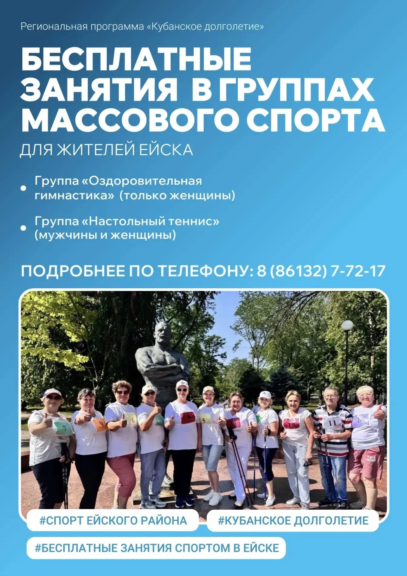 В рамках программы «Кубанское долголетие» на безвозмездной основе по понедельникам, средам и пятницам в Ейске проходят занятия в группах — «Оздоровительная гимнастика» (только женщины) и «Настольный теннис» (мужчины и женщины).