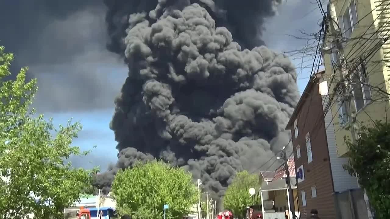 Нефтепродукты выбросило из резервуара горящего НПЗ, они попали на проезжу часть, повреждены несколько автомобилей.
