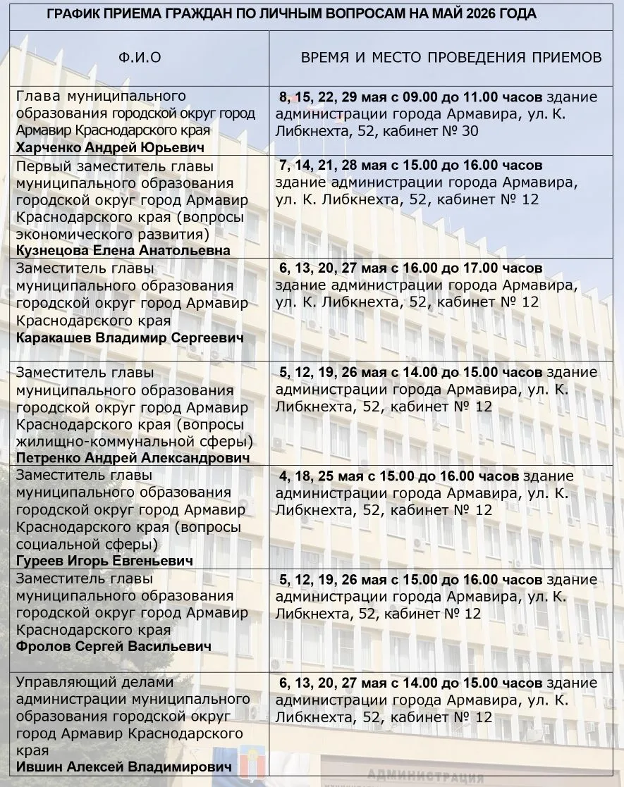 ГРАФИК ПРИЕМА ГРАЖДАН ПО ЛИЧНЫМ ВОПРОСАМ ГЛАВОЙ МУНИЦИПАЛЬНОГО ОБРАЗОВАНИЯ ГОРОДСКОЙ ОКРУГ ГОРОД АРМАВИР КРАСНОДАРСКОГО КРАЯ И ЕГО ЗАМЕСТИТЕЛЯМИ НА МАЙ 2026 ГОДА