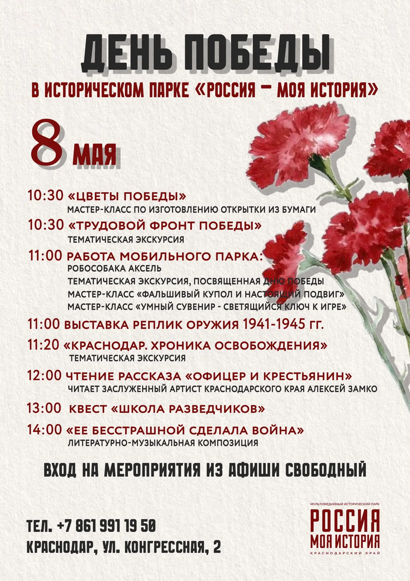 В Историческом парке «Россия – моя история» Краснодара 8, 9 и 10 мая состоится цикл мероприятий ко Дню Победы