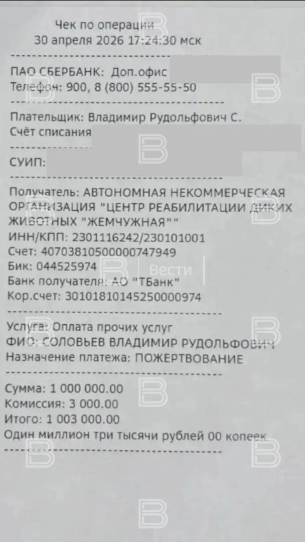 Владимир Соловьёв перевел 1 млн рублей на помощь животным в Туапсе, как обещал во время дебатов с Викторией Боней, сообщает ИС "Вести".