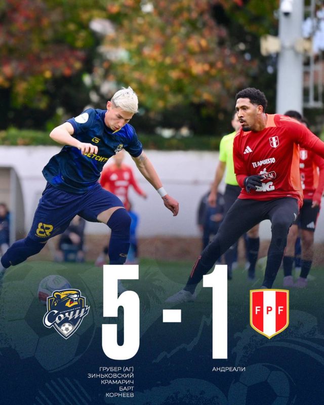 Футболисты «Сочи» разгромили в товарищеском матче сборную Перу со счетом 5:1.Команды сыграли три тайма по 25 минут. Матч прошел в закрытом режиме на тренировочной базе «Сочи».В составе «Сочи» отличились Антон Зиньковский, Мартин Крамарич, Руслан...